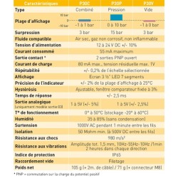 Les vacuostats / pressostats et combinés série P30 offrent la possibilité de travailler sur une plage d’affichage combiné, en pression ou en dépression et affichent les données reçues. Ils sont très simples d’utilisation et s’adaptent aux zones les plus confinées grâce à leur faible encombrement et leur connexion facile. La fonction de verrouillage permet d’éviter les réglages non autorisés